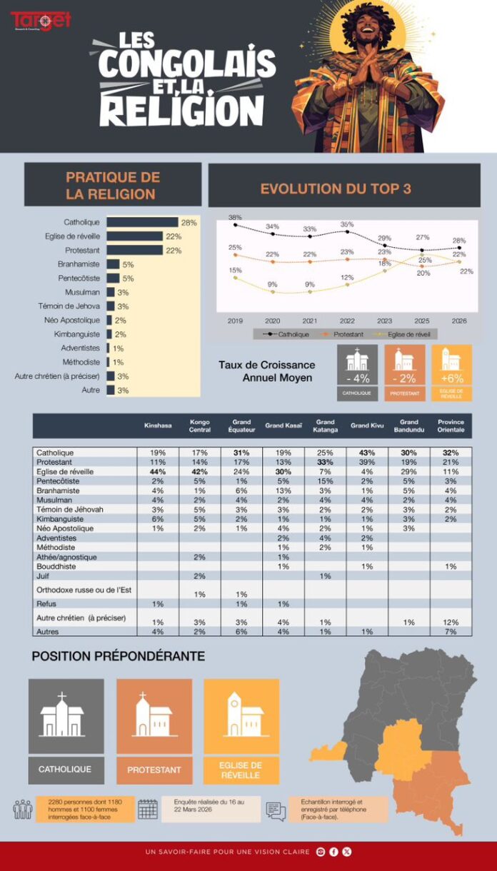 Kinshasa, 8 avril 2026- Le paysage religieux en République démocratique du Congo demeure structuré autour de trois grandes confessions qui concentrent à elles seules 72 % de la population enquêtée. Selon les données du cabinet d’études de marché Target, l’Église catholique arrive en tête avec 28 %, suivie des Églises de réveil (22 %) et des Églises protestantes (22 %).
